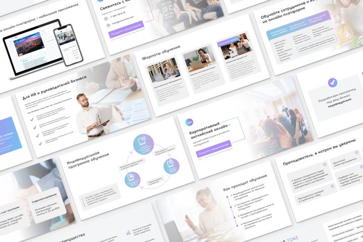 Дизайн презентации для языковой онлайн-школы Toki. Работа выполнена в PowerPoint/ Figma + PDF файл с кликабельными ссылками