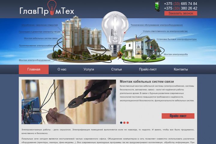 Дизайн сайта-визитки по электромонтажным работам в Гродно. На сайте представлен перечень услуги компании, примеры работ, а так же стоимость услуг для юридических и физических лиц. Год запуска: 2012