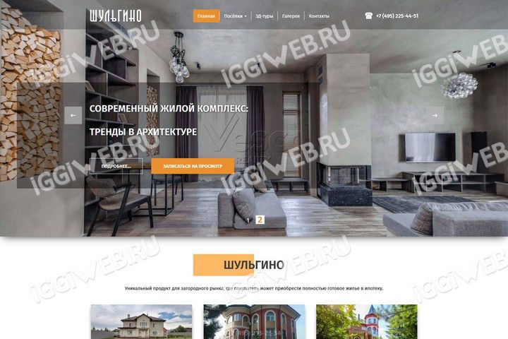 Сайт коттеджного поселка, адаптивный дизайн. Карточка коттеджа с выводом характеристик и каруселью других коттеджей из того же поселка.