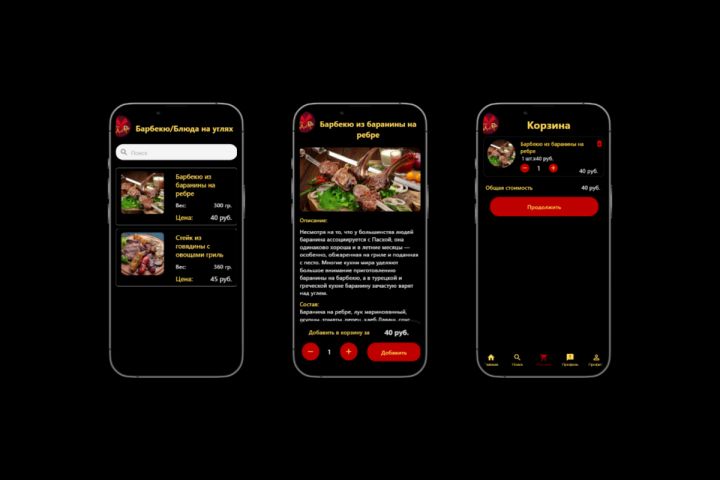 Мобильное приложение по заказу еды на Adalo. В приложение интегрированы: