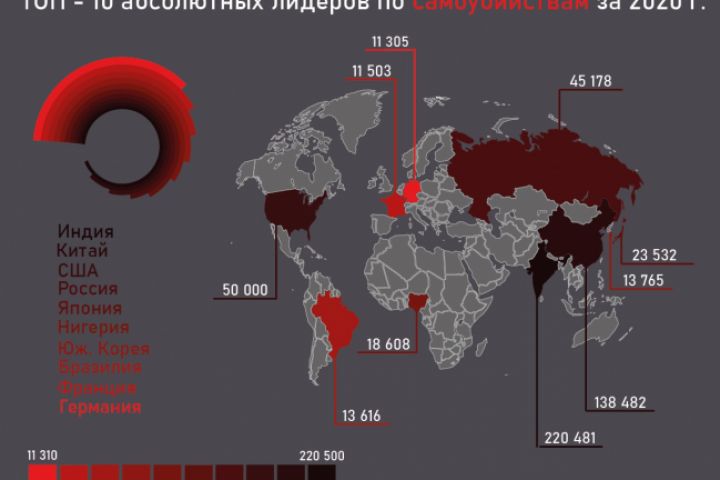 Инфографика на тему "10 лидеров по самоубийствам за 2020год"
