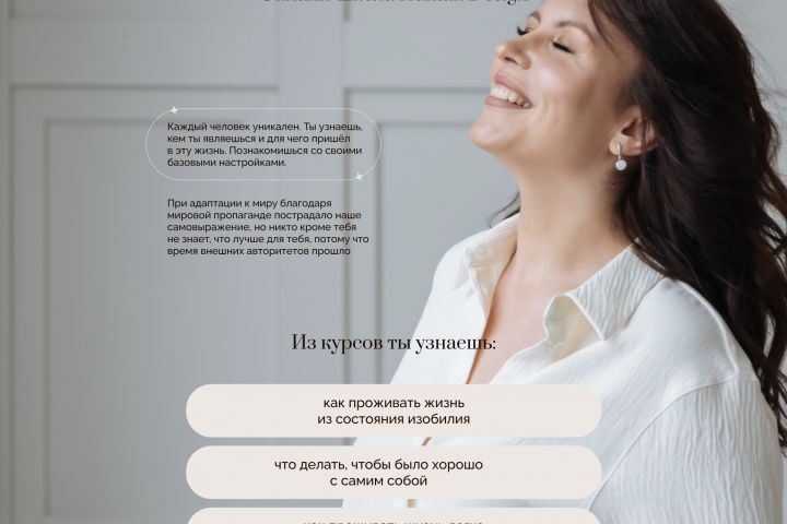 На сайте нужно было отразить предлагаемые услуги, контакты. Также на сайте можно приобрести программные свечи, браслет и книгу. Все это необходимо было сделать в светлых тонах. Особое пожелание Екатерины, чтобы фотографии максимально плавно переходили в фон.