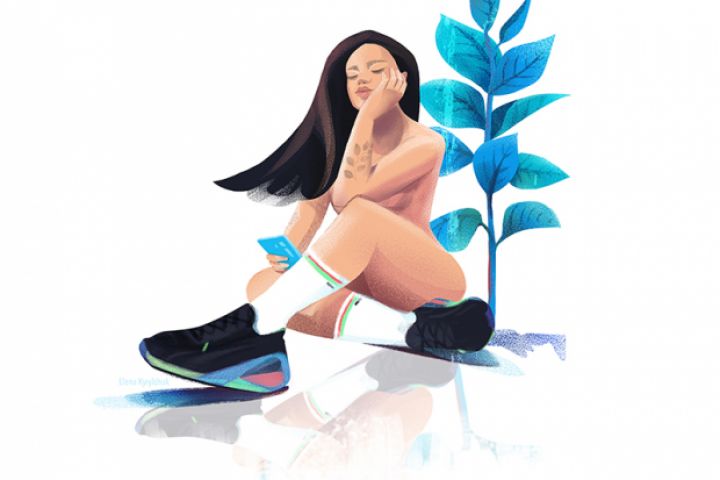 Иллюстрация обноженной девушки со смартфоном, в кросовках и с тату.