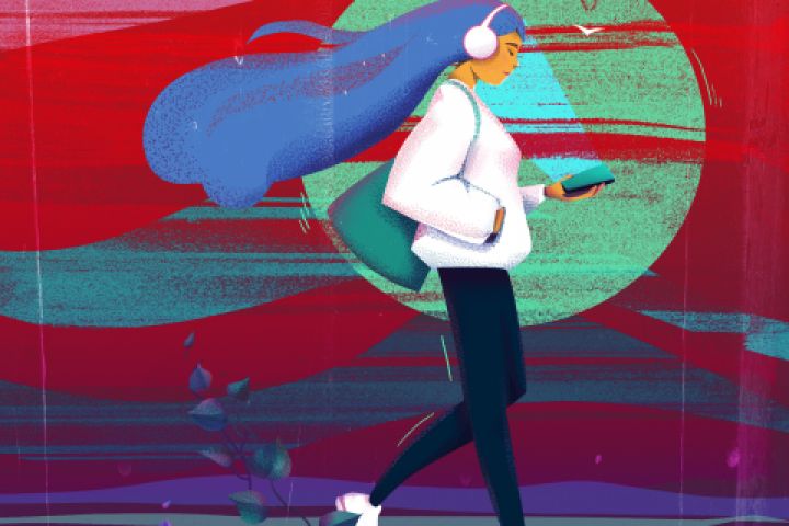 Девушка на прогулке со смартфоном и в наушниках