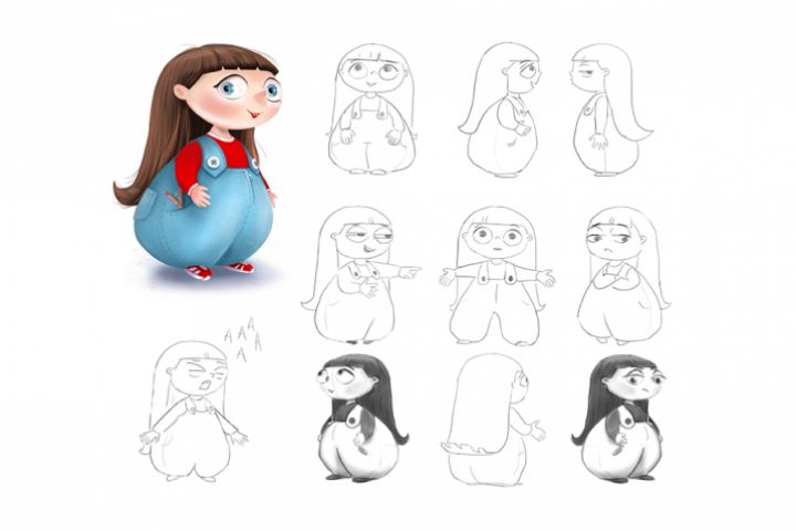 Дизайн персонажа девочки, изображение героя в разных позах и с разными эмоциями.