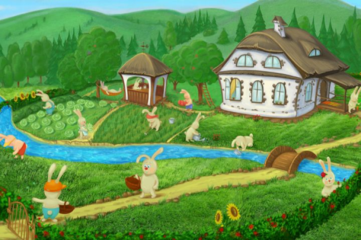 Иллюстрация для книги рассказов о зайках, осенняя и летняя сцены