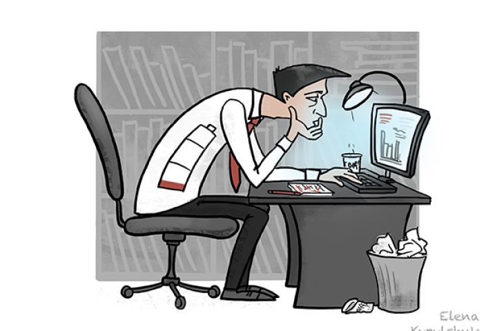 Юмористическая иллюстрация, карикатура "Весь в работе" деловой человек, офисный сотрудник, програмист