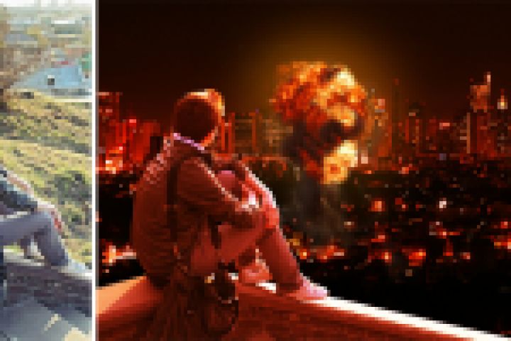 На самом деле мальчик сидит белым днем на набережной и смотрит на Волгу, но с моей легкой руки он оказался... Уж даже и не знаю, куда его занесло))) Взрыв тоже рукотворный.
