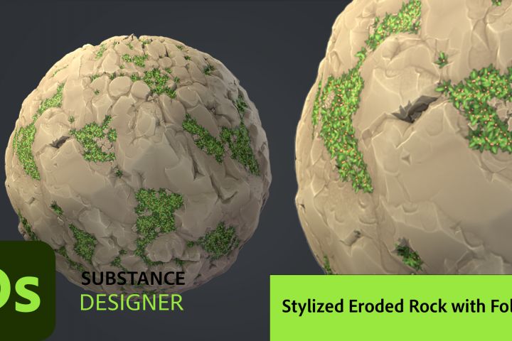 Стилизованный камень c эрозией и с листвой подойдет для фэнтезийных экстерьеров. Substance 3D Designer