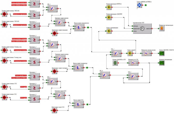 Одна из функциональных схем работы ПЛК. Программа для ПЛК выполняет функции обработки некоторых дискретных сигналов и реализует множество ПИД-регуляторов. Реализована система защит и сигнализаций, передачи данных на верхний уровень.