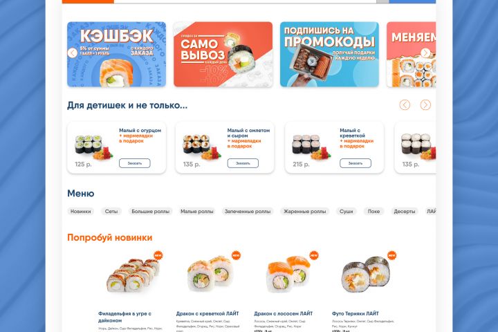 После этого мы приступили к разработке графического контента, такого как фотографии блюд, изображения для баннеров и ячеек на сайте. Наша задача была показать клиентам, насколько вкусные и аппетитные роллы Gimme Rolls могут быть.