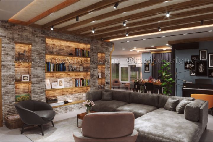 Дизайн кухни-гостиной в гостевом доме банного комплекса