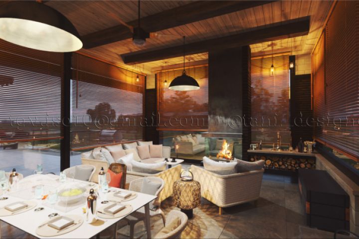 Дизайн кухни-гостиной в гостевом доме банного комплекса