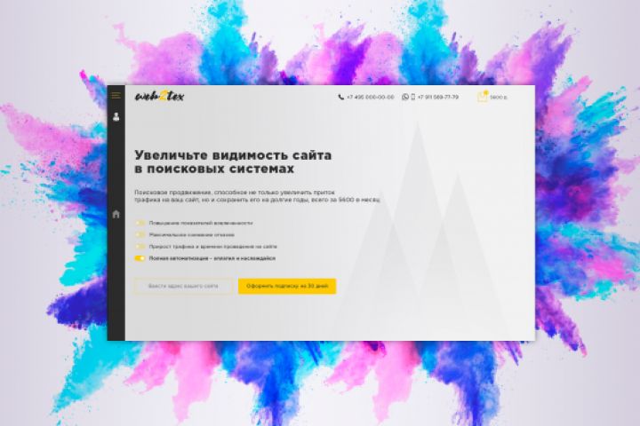 -Дашбоард (главная страница), где показаны: баланс (возможность его пополнить), отчёты и графики по продвигаемому сайту (сами графики не делал, т.к. были использованы сторонние плагины), история покупок, услуги и товары, интересные материалы.
