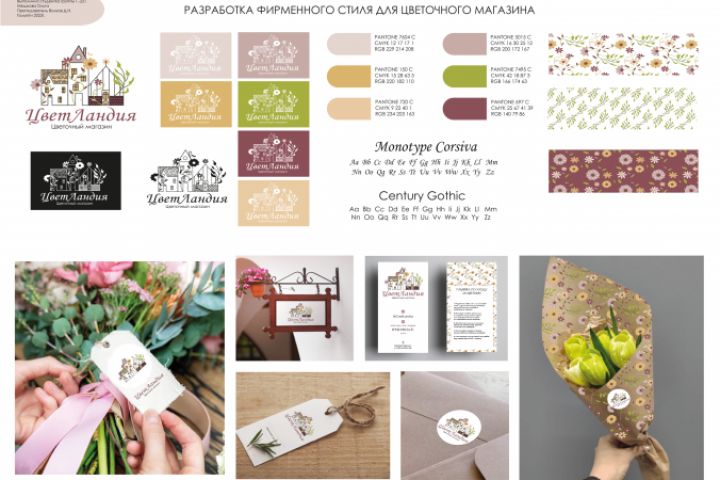 Изготовление фирменного стиля, и логотипа для вымышленной компании по продаже цветов и букетов. С представленными выворотками на белом, черном, и фирменных цветах. Фирменные цвета, фирменные гарнитуры. Паттерны, и мокапы для визуализации. Так же разработка визитки, которая показана в примере.