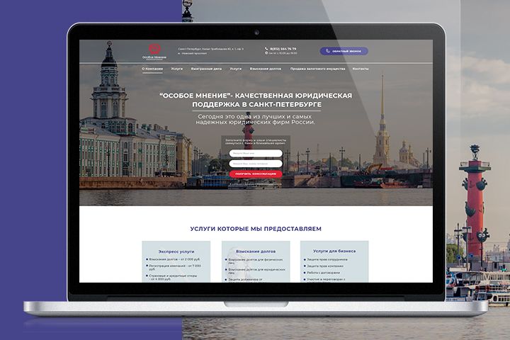 Главная страница сайта для юридической компании "Особое мнение". Общие работы проведенные на сайте: - Анализ конкурентов - Разработка дизайна