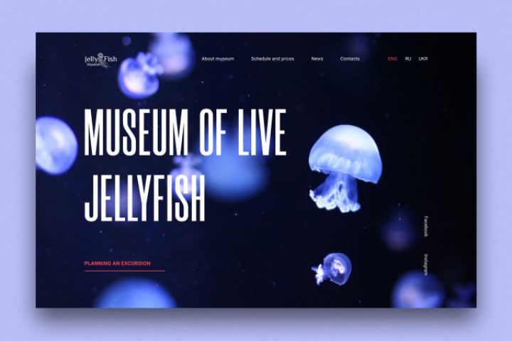 Landing Page для музея медуз в Киеве. Дизайн выполнен в темно-синих тонах, поглощающих в атмосферу тематики.