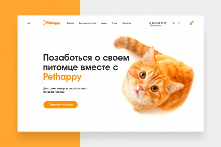 Исходя из данной тематики, были подобраны два акцентируемые цвета - оранжевый и белый, которые выражают исключительно положительные эмоции, так как сайт предназначен для любителей домашних животных, добрых и заботливых людей. Следовательно дизайн сайта, вызывая определенные ассоциации, подталкивают сделать покупку для любимого питомца.