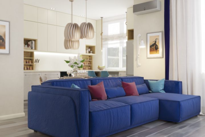 Кухня-гостиная общей площадью около 40 м2. Полы - инженерная доска по спецвыкрасу, стены - обои, Бельгия. Кухонная мебель в отделке "бетон" и покраске по RAL. Несколько зон и продуманное управление светом позволяет создавать различные сценарии освещения.