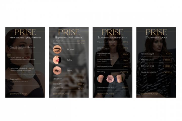 Был выбран эстетичный и премиальный стиль для карточек. Изящные шрифты, золото в шрифтах, качественные эстетичные фото вместе создали ощущение премиальности услуги и ее высокого качества