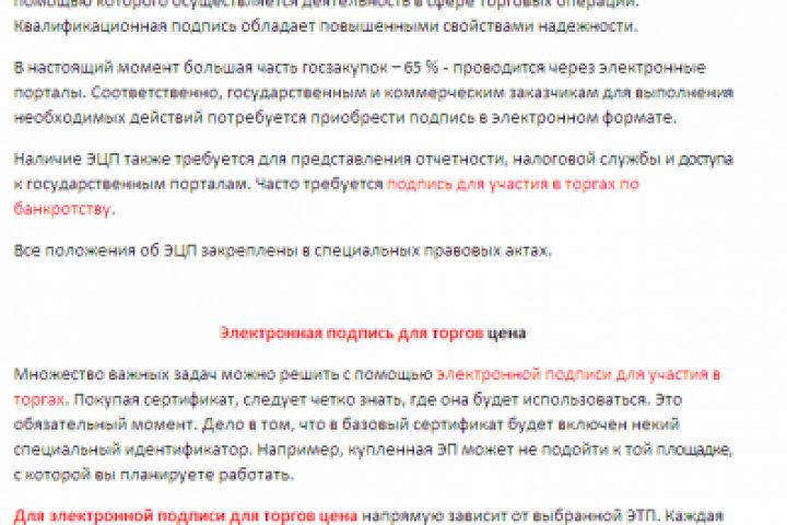 В работе описываются нюансы получения и стоимость электронной подписи для торгов.