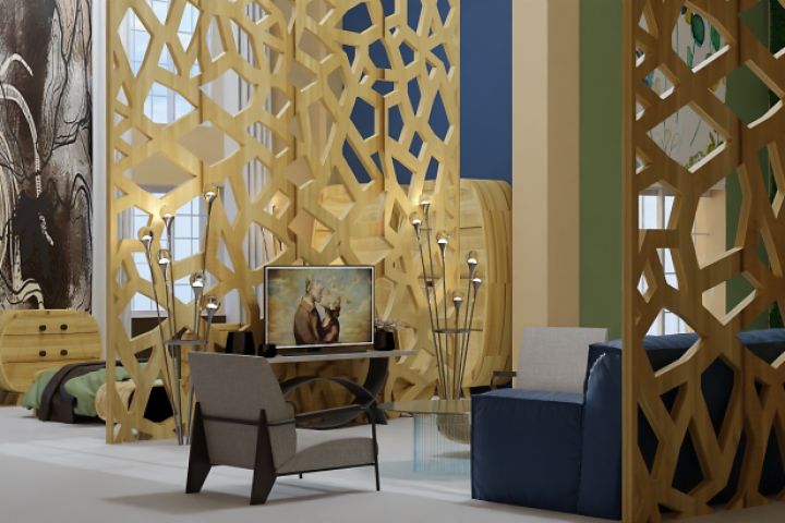 3D визуализация проекта двухуровневой квартиры "Слияние разумов". Проект в эко стиле с элементами стиля техно. Визуализация гостиной, вид №2.
