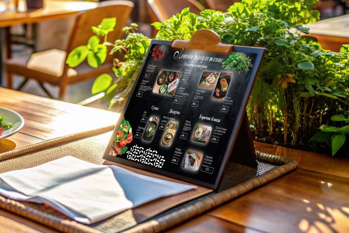 По ТЗ заказчик хотел меню горизонтального расположения формата А3. Изображения блюд предоставлены заказчиком.