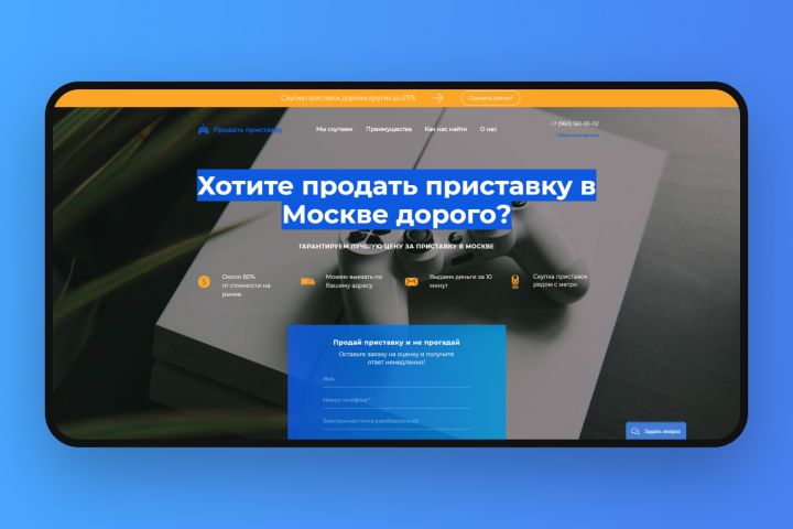 Был разработан Landing page для скупки приставок в Москве на конструкторе platformaLP. Сайт имеет поисковую оптимизацию, зарегистрирован в Google и Яндекс, подключен к Яндекс метрике и Google analytics