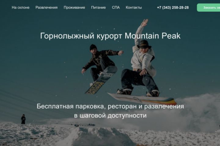 Многостраничный сайт горнолыжного курорта. Страницы с проживанием - отель, коттеджи; с СПА - бассейн, массаж, бани; с питанием - кафе, ресторан; с развлечениями зимой и летом и т.д.