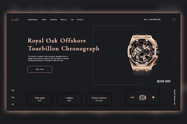 Требовалось разработать дизайн landing page для дорогих часов, я разработал прототип, продумал структуру сайта, создал дизайн. Из материалов у меня были тексты и фото часов.