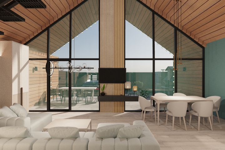 Визуализация гостинной-студии в барнхаусе