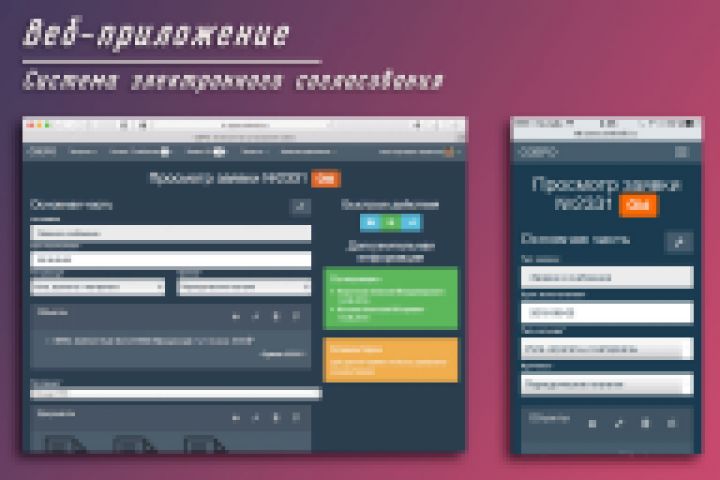 Веб-приложение написано с нуля по модели MVC с использованием PHP, HTML5, CSS3, JS, AJAX, JSON, MySQL, Bootstrap 3. Приложение является внутренней системой заказчика, служащей для согласования документов, выдачи пропусков, а так же выполняющая роль Service Desk. Продукт разрабатывался с учетом классификации уязвимостей OWASP TOP 10.
