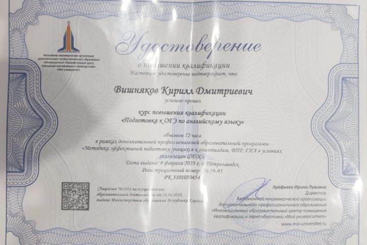 Прошел курс повышения квалификации (72ч) «Подготовка к ОГЭ по английскому языку»