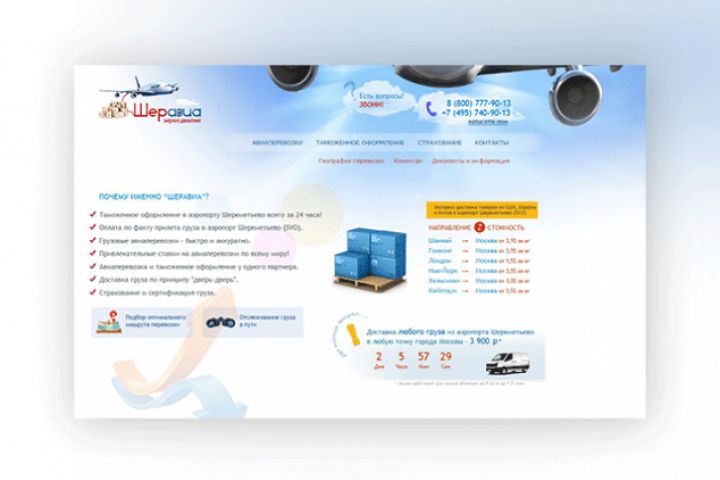 Крупный сайт для московской компании, которая занимается авиадоставкой грузов из различных стран. Выполнены дизайн, верстка и настройка системы сайта.