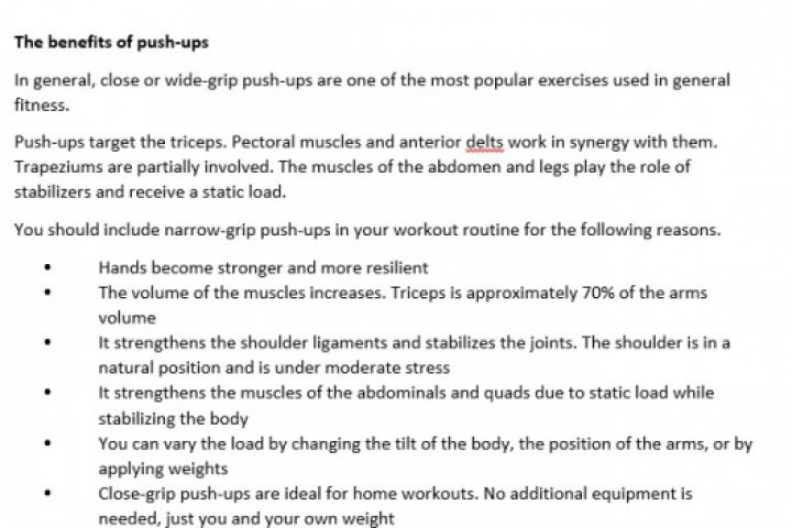 Переводила большой фитнес сайт на английский язык. Пример перевода одного упражнения в приложении