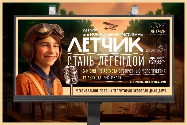 Для фестиваля я создал уличный баннер, копии которого разместили вдоль трассы, ведущей к месту проведения фестиваля. Заказчик в процессе обсуждения попросил сделать баннер уютным, теплым и немного винтажным. Эстетика баннера должна отразить романтику полета и мечты юношей середины 20 века о карьере летчика. Данная идея является основой концепции бара "Китайский летчик Джа Да", поэтому ее решено было применить и в дизайне наружной рекламы, сместив акцент на другие ключевые точки: детство, лето, музыка.