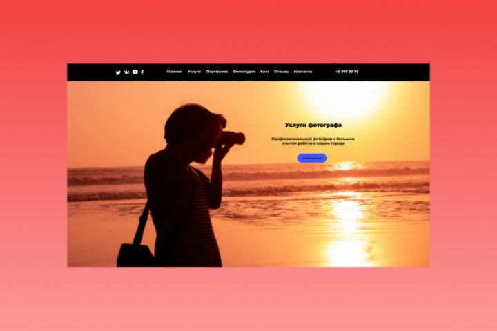Здесь мы можем увидеть сайт индивидуального фотографа. Работа достаточно объемная, поэтому оставлю ссылку . Не хочу впрыскивать много воды тебе в уши, поэтому просто чекни сам. Если тебе понравится моя работа, то можешь заказать подобную. Да и для этой работы есть планшетные и мобильный дизайн.