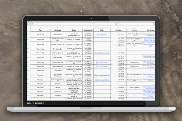 Ручной сбор базы продуктовых магазинов, аптек, фитнес-центров, развлекательных центров, кинотеатров, магазинов здорового питания, АЗС, кинотеатров, детских развлекательных центров, пивных баров, ресторанов, отелей по г. Алматы и Алматинской обл. (до 100 км).