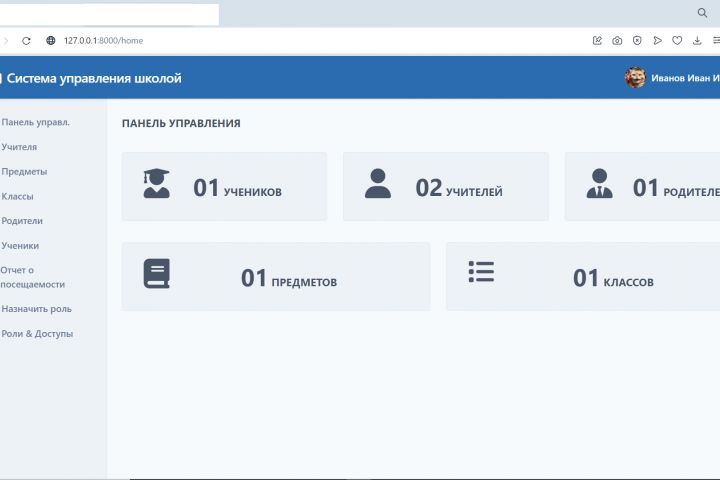 Система помогает вести учёт всех учеников, а также родителей, учителей, классов и так далее. Содержит все функции управления посещаемостью, позволяет управлять предметами и отчётами. Проект содержит панель администратора с панелями учеников, учителей и родителей. У ученика есть ограниченный доступ к нему. Он может просматривать только свой профиль, записанные предметы и доступный отчёт о посещаемости, может обновлять свой профиль.