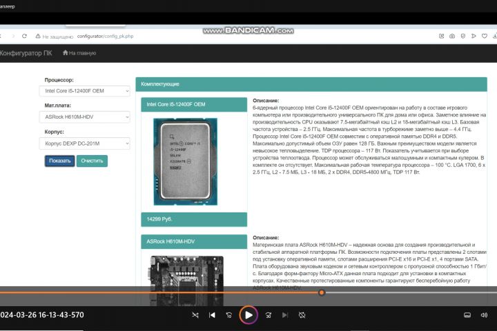 Цель: Создать конфигуратора ПК, создать веб-приложение и оформить дизайн сайта (но дизайн не нужно делать ультра современный и анимированный, что-то простое и более менее симпатичное), суть приложения должна основываться на конфигураторе от DNS, веб-приложение должно основываться на том, что вы выбираете главный элемент: процессор или видеокарту и будущие предлагаемые компоненты должны быть все совместимы с элементом который вы выбрали, (например выбрали определенную мат. плату и затем в списке предлагаемых процессоров должны быть процессоры, совместимые с этой мат. платой, вот такая идея), база данных должна содержать от 40 компонент(т.е например 50 процессоров и 45 видеокарт и т.д), так же должно быть минимальное описание каждой компоненты в виде характеристик (как реализовать это описание на ваше усмотрение можно просто при наведение на иконку элемента, можно отдельной страницей) и у каждой компоненты должна быть своя цена для того чтобы в конце конфигурации вывести полную сумму собраной сборки. Так же для неопытных пользователей нужно набросать готовые сборки по бюджету и цели использования ПК.(например создать отрезок цен, пользователь может выбрать какую-то сумму например 90к и сайт предложить уточнить для каких целей нужна сборка: гейминг, 3д моделинг, учеба или работы и т.д. и в итоге приложение выводит на экран готовую сборку и ее сумму)Много конфигураций для этого задания не нужно делать.К примеру есть диапазон от 50к до 300к и создать сборку под каждую нужду в отрезке от 10к до 50к, от 50к до 100к и т.д. ВСЕ примеры только улучшают понятность сути, все отрезки и диапазоны можете брать на ваше усмотрение. И последнее задание: т.к вы делаете работу на курсовую работу нужно пояснение работы, чтобы я смог ее защитить (у меня есть пример курсовой на эту тему, там красиво описан алгоритм с 11 страницы выполнения задачи с внутренней стороны, желательно оформить на подобии с этим документом, можно даже позаимствовать некоторые идеи от туда, но под копирку делать сайт не надо , оформить нужно именно сам