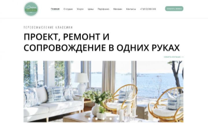 Работа выполнена в светлых уютных тонах, соответствующих стилистике дизайнера. Достаточно информативный, но не перегруженный информацией сайт, делающий акцент на приятной глазу картинке, побуждающей клиента к желанию приобрести комфорт.