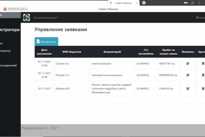 Сменные водители вносят заданных 5 полей, которые сохраняются в определённые файлы или БД с возможностью просмотра, выгрузки и редактирования администратором.