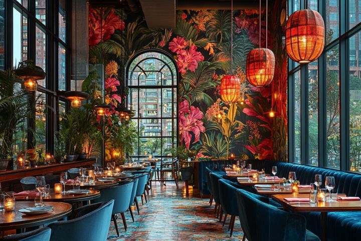 Стены, украшенные тропическими мотивами, создают эффект внутреннего сада.