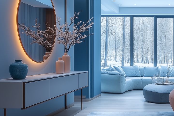 Минималистичное пространство с акцентом на глубокий сине-голубой фон. Теплое подсвечивание круглого зеркала и декоративные вазы пастельных оттенков добавляют мягкости и визуального тепла. Атмосфера — свежая, но гостеприимная.