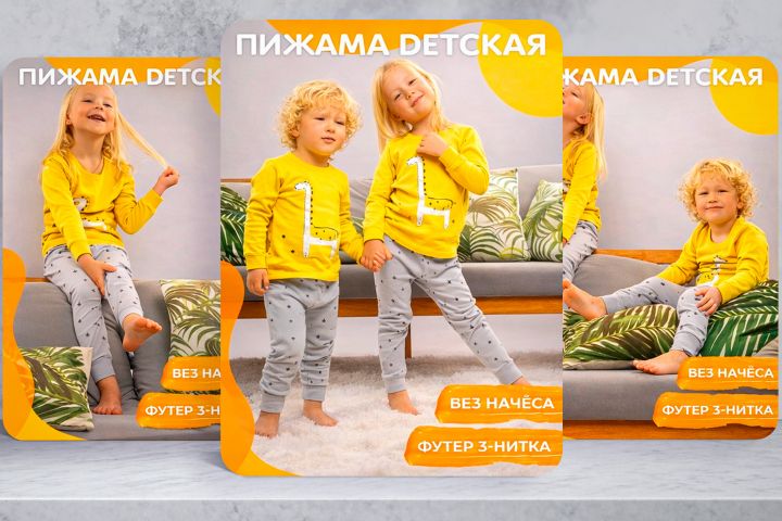 Ко мне обратились с задачей разработать продающие карточки товара для детской пижамы на маркетплейсе Wildberries. Основная цель — выделить товар среди конкурентов, повысить кликабельность и конверсию в покупку. Важно было создать яркий, понятный и эмоционально привлекательный визуал, ориентированный на родителей.