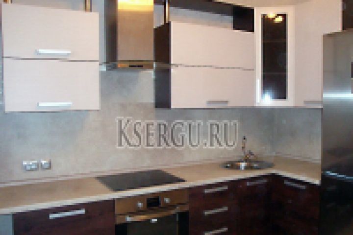 Кухня с фасадами МДФ с покрытием ПВХ-плёнка. Разгружаем верх, используя открытое пространство.