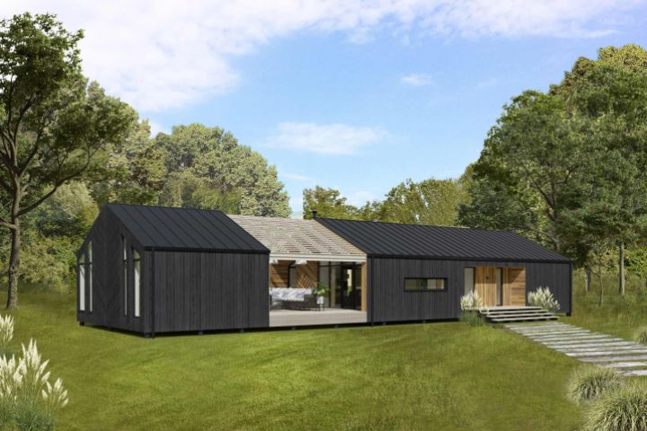 Формообразование происходит путем удлинения базового дома в одном направлении, увеличивая спальни на 1 метр в глубину, оснащаясь террасой в минимальном варианте и террасой + третья функция (гостевой дом, баня, летняя кухня, мастерская) - в максимальном варианте.
