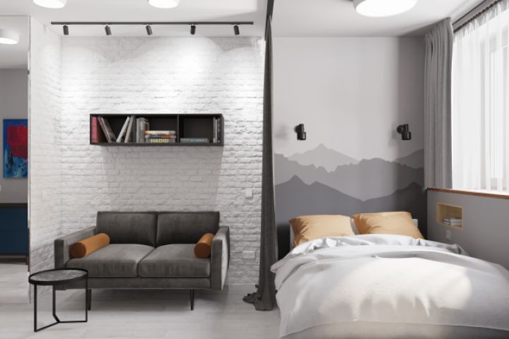Отопление всей квартиры производится с помощью газового котла, расположенного на кухне. По этой причине невозможно было совсем отказаться от прегородки между кухней и гостиной-спальней.