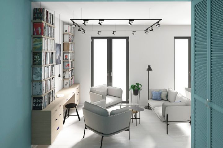 Концептуально пространство делится на разноцветные блоки: светло-синяя спальня, темно-синяя прихожая. Оба пространства вливаются в объединяющее белое пространство гостиной. Таким образом спальня становится немного темнее и приватнее, прихожая читается монолитным объемом и не акцентирует на себе внимание, кроме ярких светильников на темном фоне, гостиная и кухня, как места основного прибывания самые светлые и открытые.