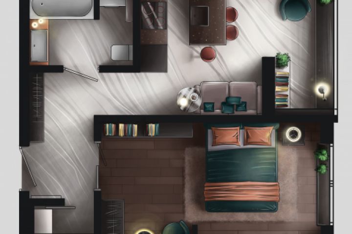 Мебель и материалы пола отрисовываю относительно вашего коллажа или фото.